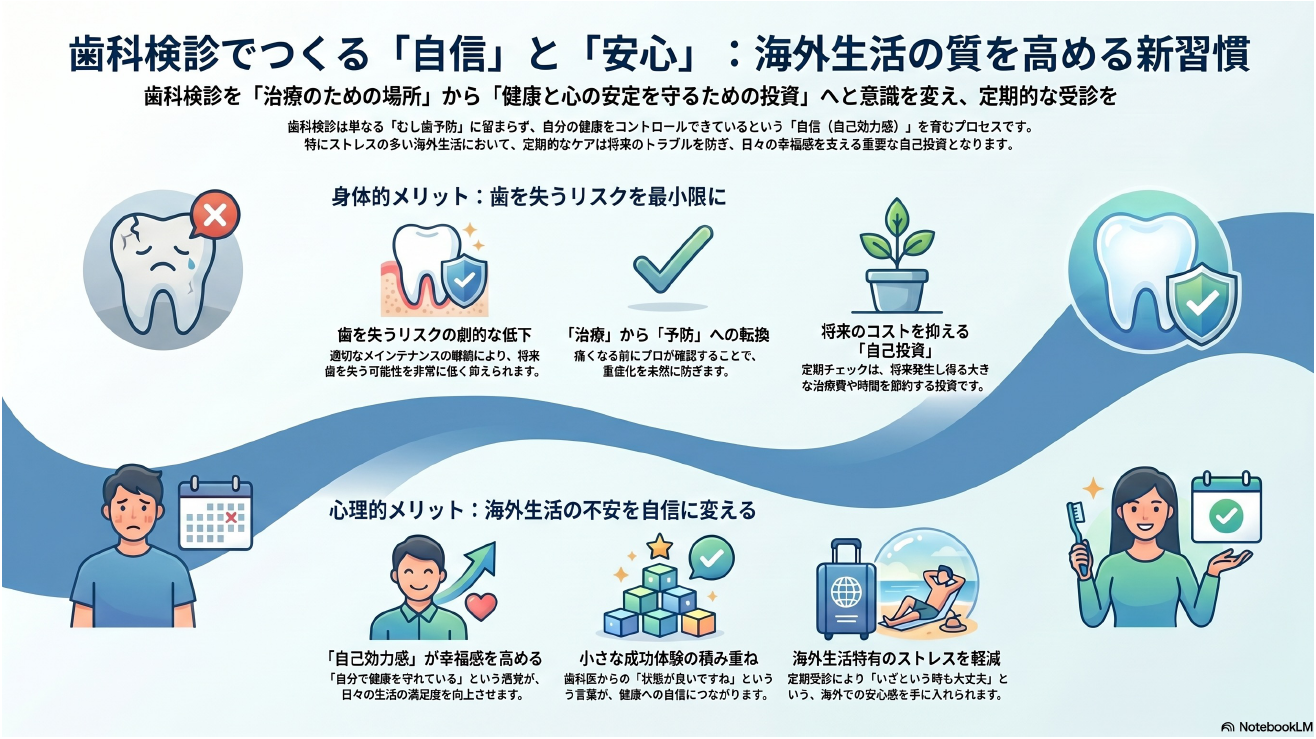 さらに海外生活では、医療へのアクセスや言葉の不安など、見えないストレスが積み重なりがちです。定期的にチェックを受けておくことは、単に歯を守るだけでなく、「いざという時も大丈夫」という安心感を持つことにもつながります。