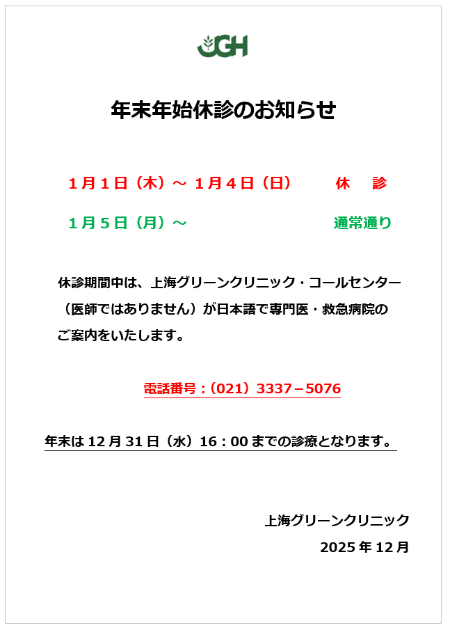 当院の年末年始の休診について、下記のとおりご案内申し上げます。