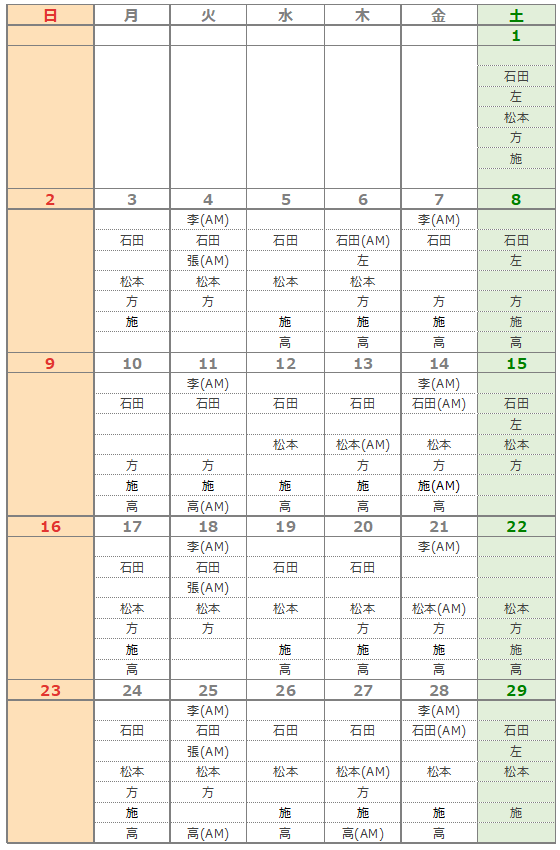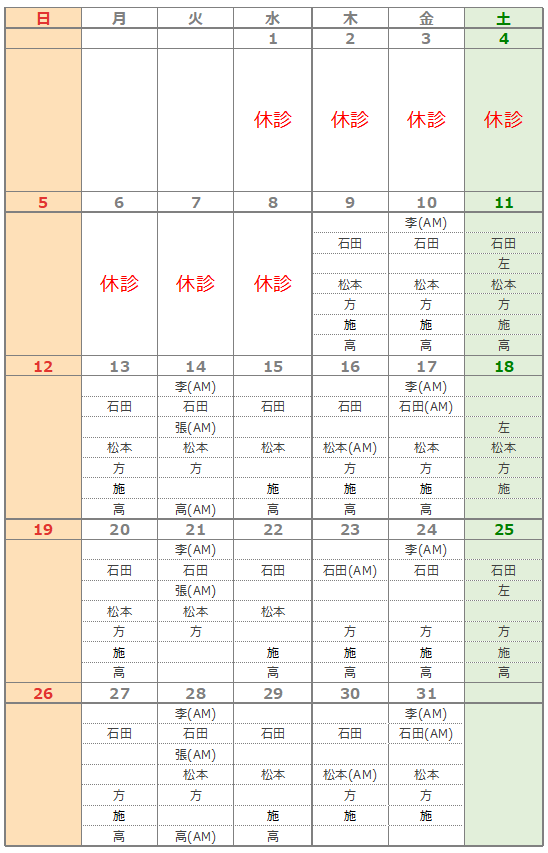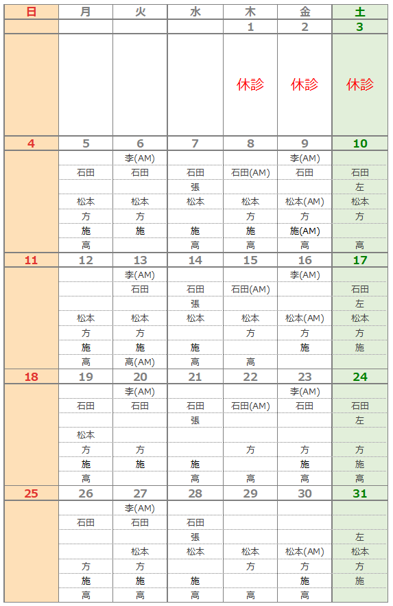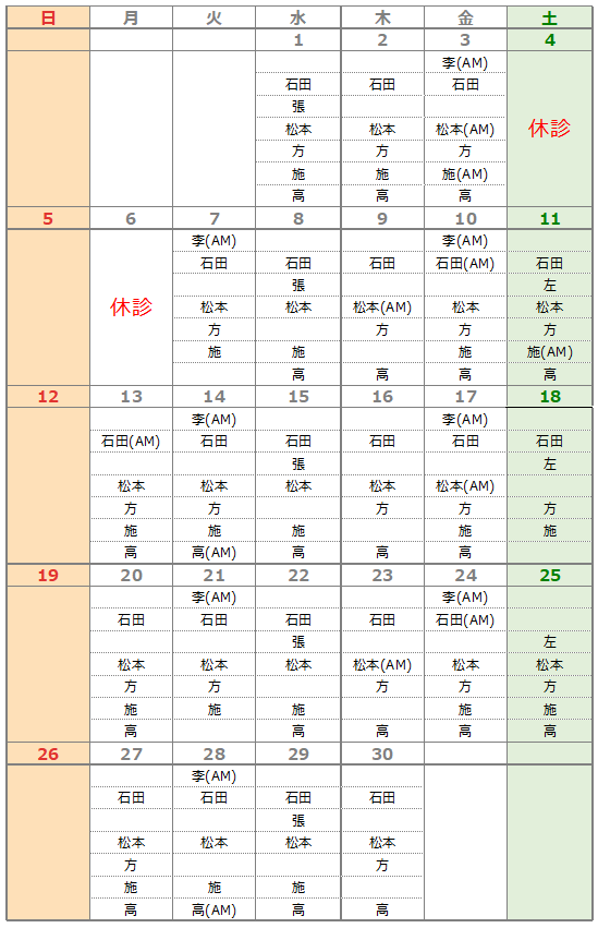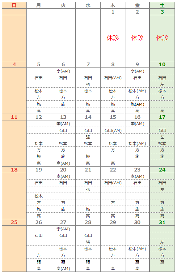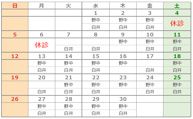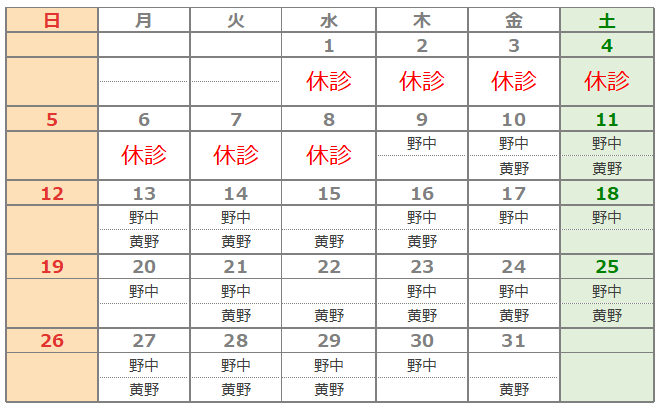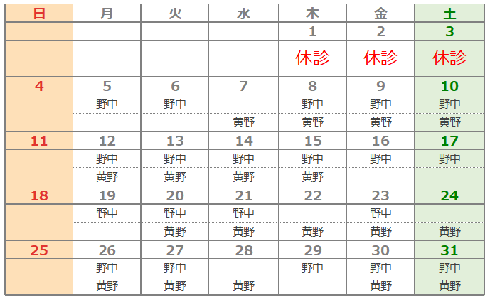 ※ 診療スケジュールは都合により変更になる場合がございますので、詳細はお問い合わせ下さい。